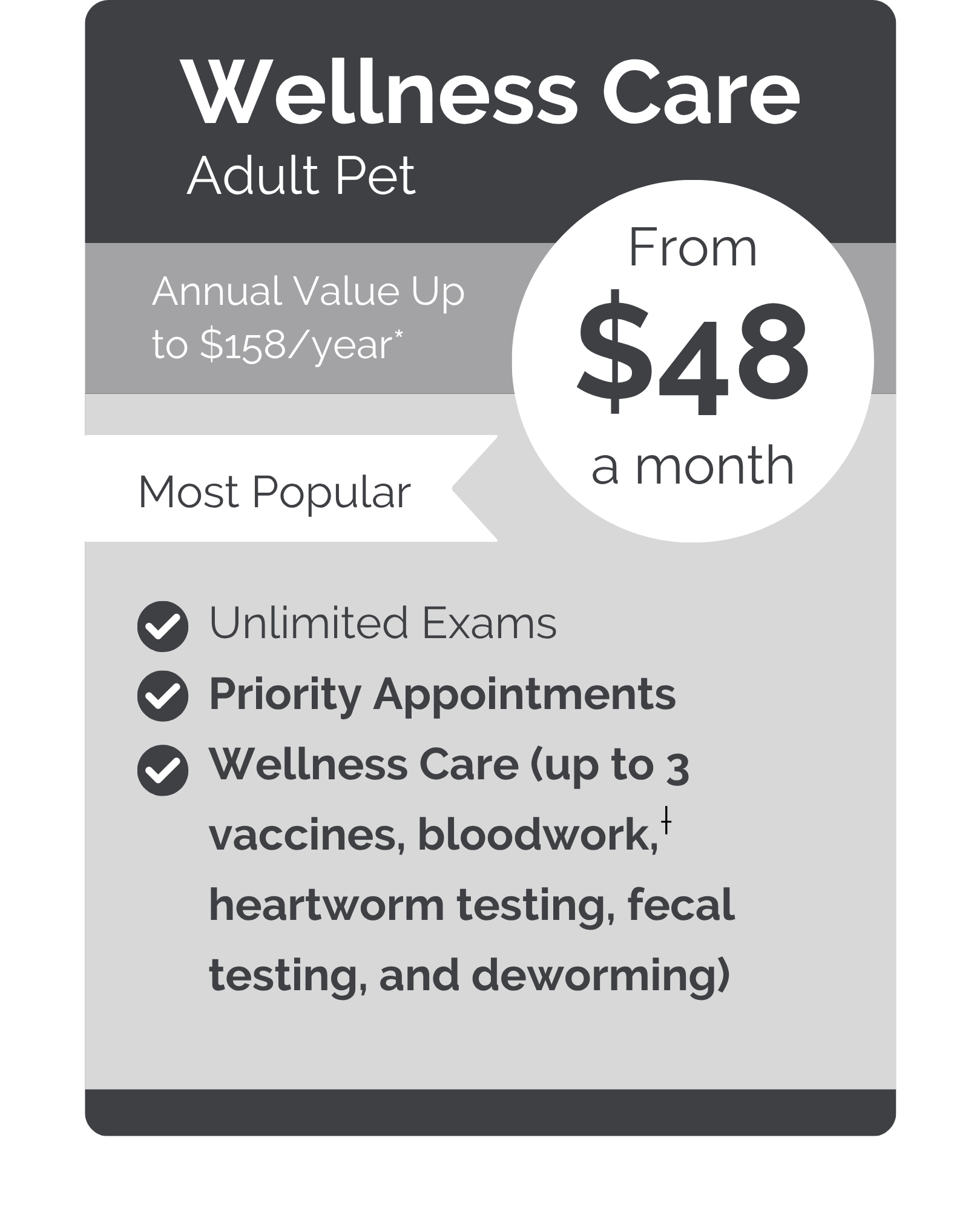 You know it yourself because it’s true; the sooner you catch an illness, the more success you have in treating it. With unlimited wellness exams included, you can stay on top of your pet’s health and wellness with preventive care, and ensure small issues never become serious ones.